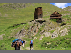 Die alten Siedlungen sind bekannt durch die Wehrtürme aus dem Mittelalter sowie die Rituale und Traditionen, die bis heute bewahrt werden konnten. Ebenso aber durch die faszinierenden Ausblicke auf schneebedeckte Berge, die blumenübersäten alpinen Hochweiden sowie Wildbäche und Wasserfälle. Das Trekking führt Sie durch diese abgelegene Berggegend. Über den 3539 m hohen Atsunta-Pass wandern Sie von Omalo (Tuschetien) in die Provinz Khewsuretien (Shatili).